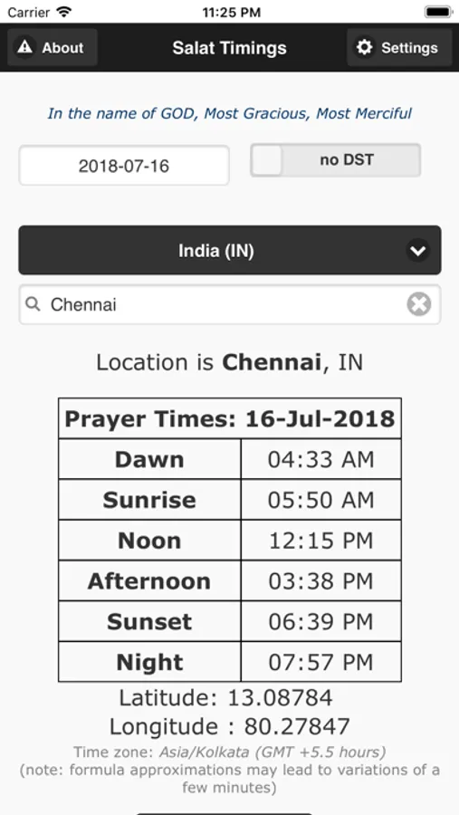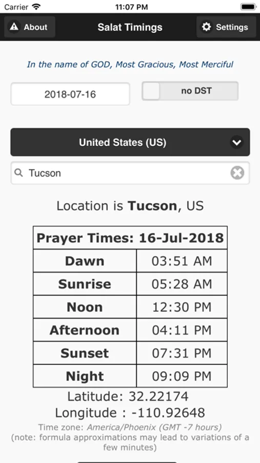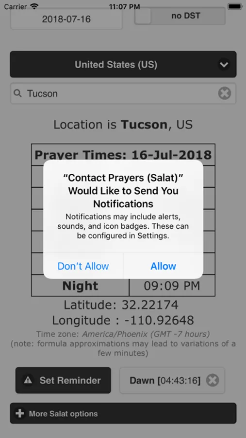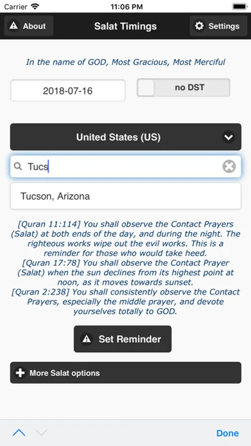 Other features: The app can, God willing, automatically adjust times for Daylight Savings (if one has an active Internet connection). You can add a Contact Prayer (Salat) reminder and choose options for notification under Settings.