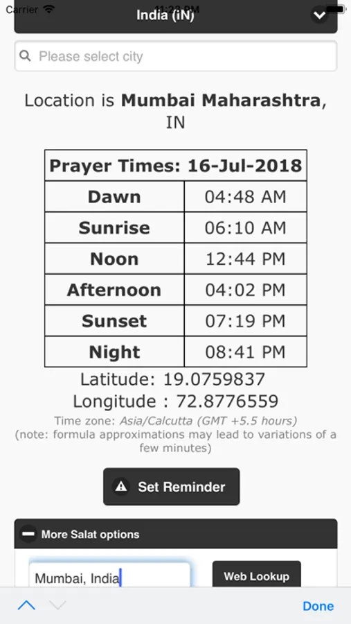The app database contains many major cities. You can choose a country and city and calculate times for the Contact Prayers (Salat / Namaz). New cities can be looked up using the "Web Lookup" feature (under More Salat options).