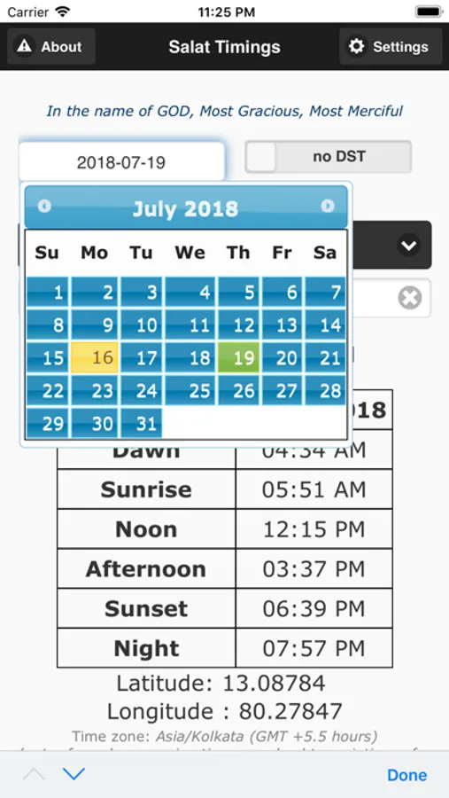By default prayer times are calculated for today (current day). You can also choose a different date to check timings for.
