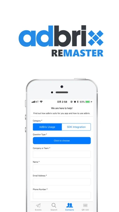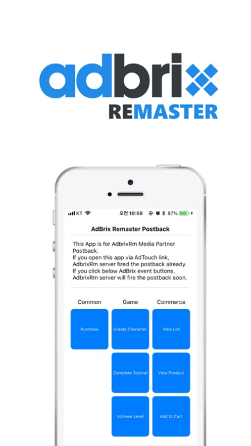 애드브릭스 리마스터의 이벤트 전송, 포스트백 로그 조회, 헬프데스크 문의, 딥링크 QRCODE 제작 및 스캔 기능을 담았습니다.