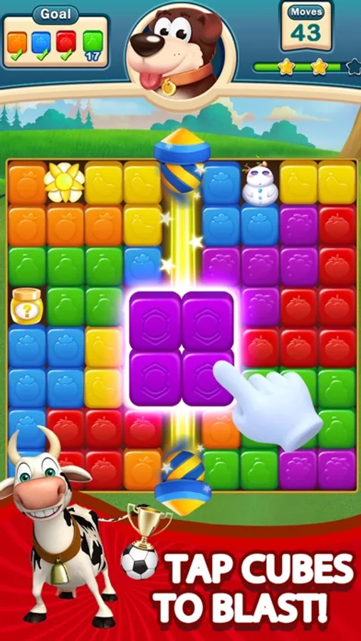 Solve puzzles to help the cow and his pets friends as they travel around fruit-farm worlds! Join the party and keep blasting fruit cubes,make fruits legendry.