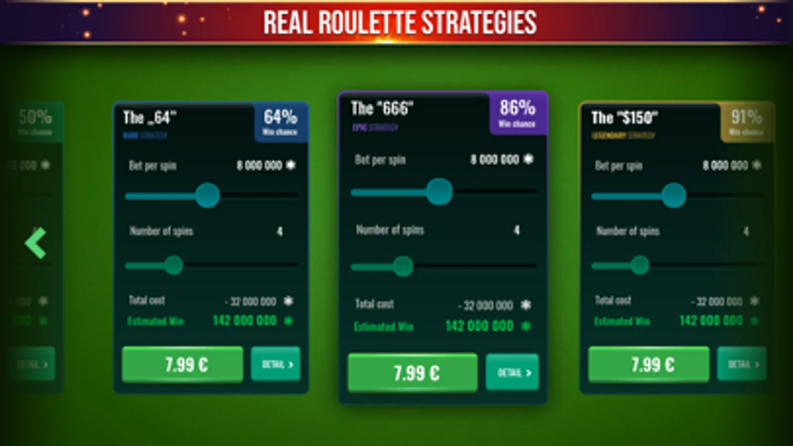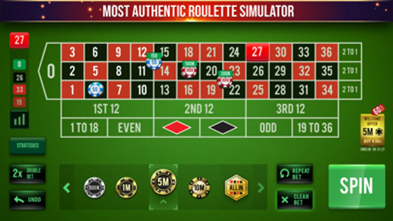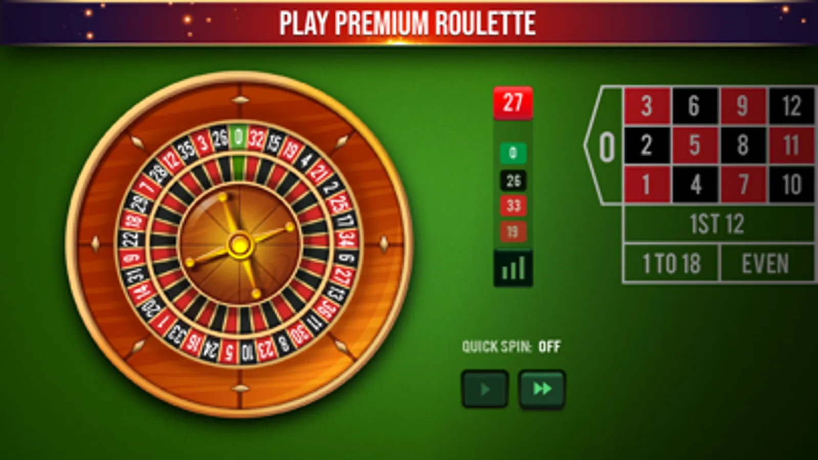 Play at friendly betting tables with easy controls in horizontal mode. Try your roulette tactics without risking your money and become an expert in one of the most popular casino games in the world.