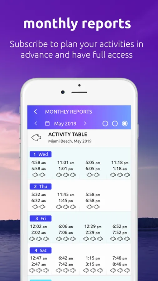 Hourly activity chart and solunar periods with the best fishing moments of every day. Monthly activity table with daily fish activity and major and minor fishing periods.