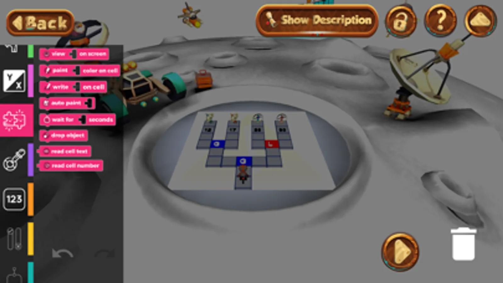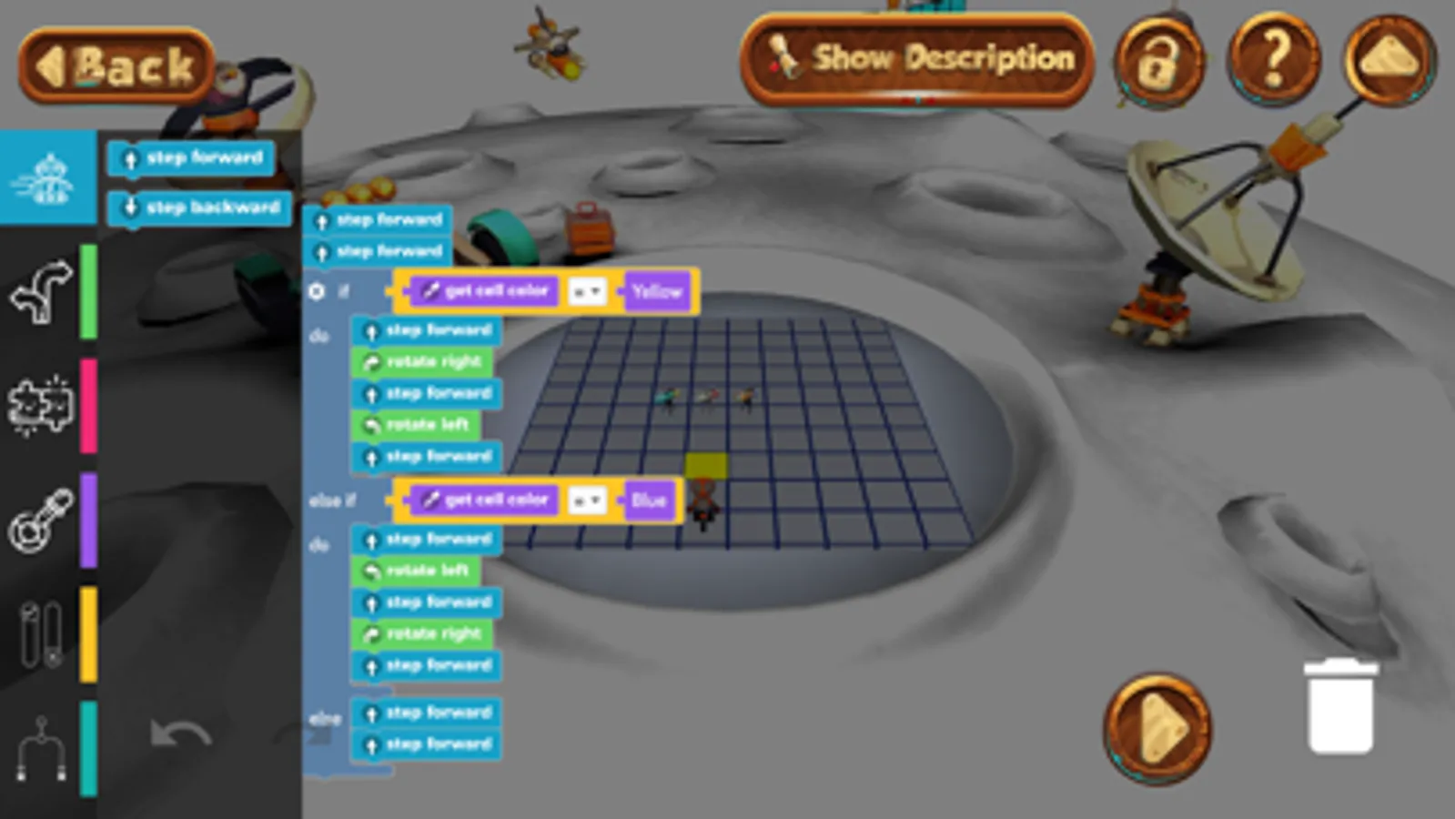 You start by downloading the game assets, selecting a mission then you will be able to build your own algorithm using the RoboGarden Coding Blocks and by keeping the playground application up to date, you will enjoy much more coding activities as we are always adding more activities to cover different coding concepts and programming languages and we are totally proud to tell you that all is FOR FREE.
