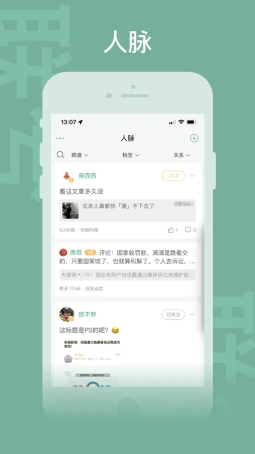 【人脉】:可以看到多度人脉发布的共享信息;方便地增减特定人、特定桥接人的信息量;可按频道、标签、关系选择浏览内容。