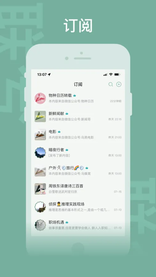 【订阅】:通过“订阅号”是和“订阅群”相搭配的设计,前者实现面向全网内容的整合和流量分发,后者实现针对订阅号的多点对多点的自动追踪,并完成粉丝的互动。
