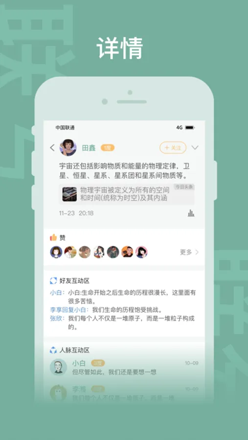联兮的多度人脉关系链设计,鼓励用户将每个人真正的好友带入联兮的内容生态当中,既为联兮和各个社群带来了用户身边更多的潜在用户,又丰富了单个使用者的社交生活。直接好友是一度人脉,好友的好友是二度人脉,好友的好友的好友是三度人脉,以此类推。多度好友构成了一张能量巨大、内容丰富的人际网络。内容虽然可以进行共享,但系统并不提供非直接好友互加好友的功能,保护好每个人的“好友边界”。同时,越近的人脉显示信息越多,越远的人脉显示信息越少。用户也可手工增加或减少特定人、特定桥接关系的信息量,提升使用的效率。
