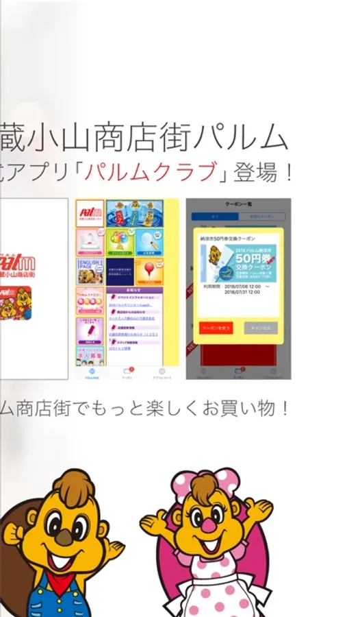アイコンのキャラクターは当商店街のマスコットキャラクター、ペアビーバーの「パル(男の子)」「パム(女の子)」です!ビーバーが作る家ように素敵な商店街、素敵な街づくりを目指して誕生しました。毎月10日「パルムの日」やイベントの際に商店街内に遊びに来ますのでお見かけの際はぜひ手を振ってあげてください!