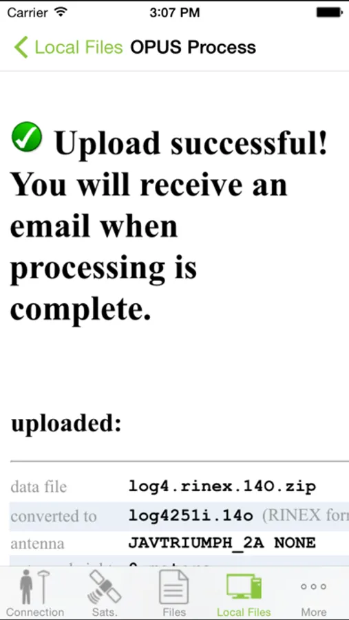 Result will be saved back into the iPhone (for OPUS you can set jmt@javad.com as e-mail address for OPUS to let the software receive OPUS answer and save it).