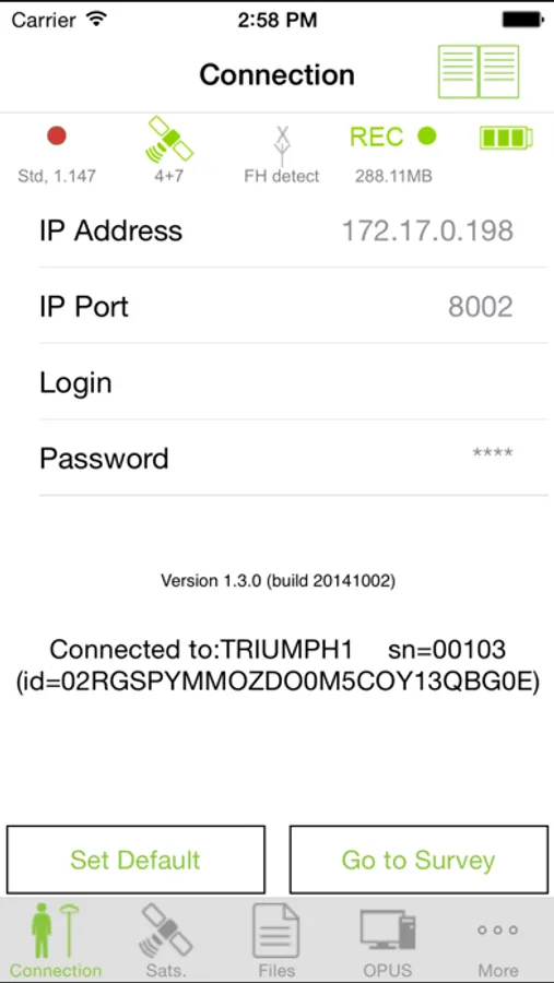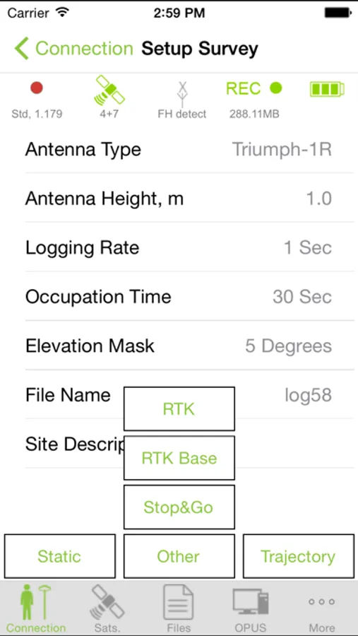 You can connect your GNSS receiver in field to iPhone/iPad/iPodTouch with WiFi connection internally implemented in JAVAD TRIUMPH-2 and TRIUMPH-1 receivers. Control site name, antenna height etc. in field. The result data can be saved into iPhone/iPad, converted into Rinex and send to NGS OPUS server to get results.