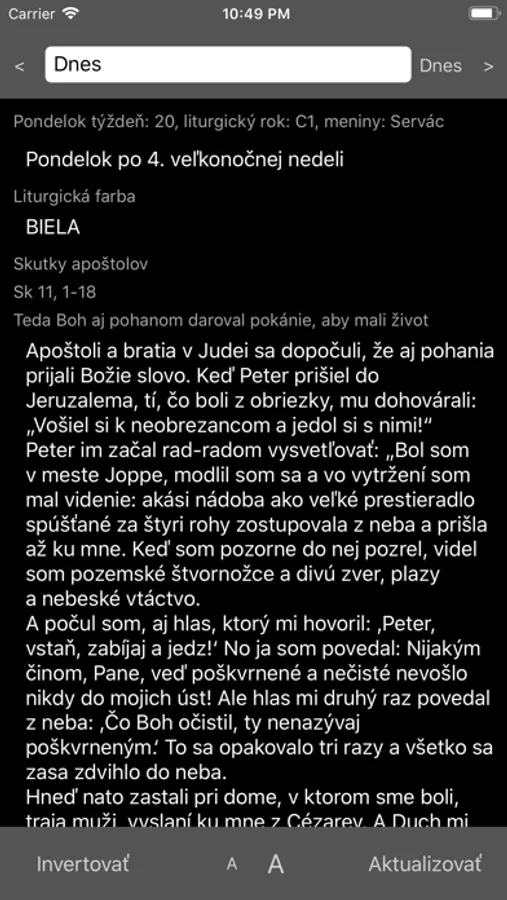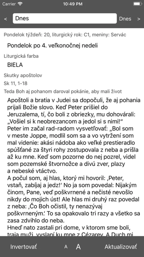 Aplikácia zobrazuje liturgický kalendár spolu s liturgickými čítaniami. Texty v aplikácii sú prístupné off-line vždy tri mesiace okolo aktuálneho dátumu, prípadne ľubovoľné zobrazené.