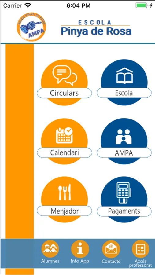 Disposa de les següents seccions: Circulars, Escola, Calendari, AMPA, Menjador, Pagaments, Alumnes, Info APP, Contacte i Accés Professorat.