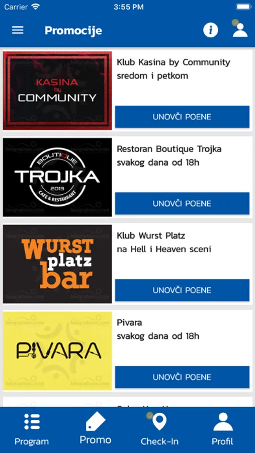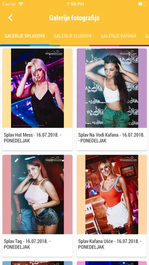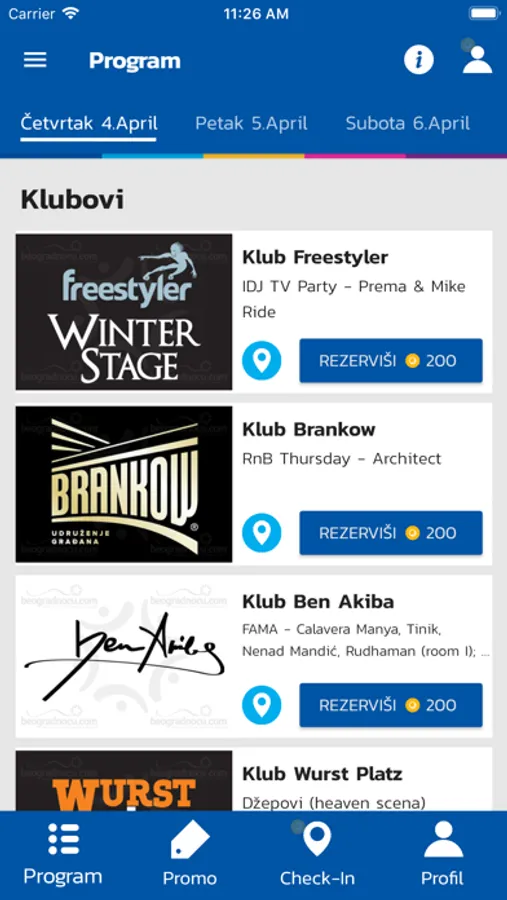 se ekran gde možete pogledati sve događaje koji su najavljeni za naredni period. Potrebno je da u padajućoj listi izaberete koji datum Vas zanima i koji tip objekta želite da posetite (splavovi, klubovi, kafane, barovi, striptiz klubovi, kafei ili restorani).