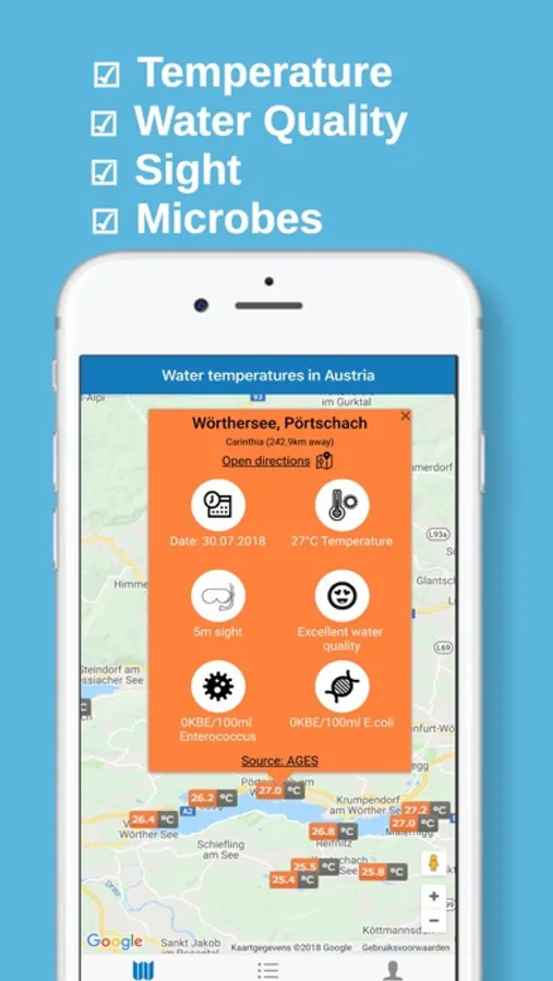 In addition to the temperature, information about the water quality, the depth of sight, and the occurrences of different germs are displayed. The germs (Enterococcus & E.coli) are provided in absolute numbers (CFU/100ml) and as a simplified categorization according to the EU's bathing water quality directive (2006/7/EC).