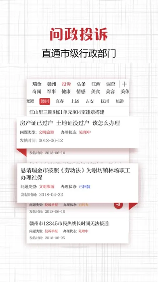 瑞金人自己的新闻头条,应用内给广大用户提供本地新闻资讯、民声投诉、精彩短视频、本地分类信息发布、省内重大事件直播等服务,瑞金本地头条,一手掌握!