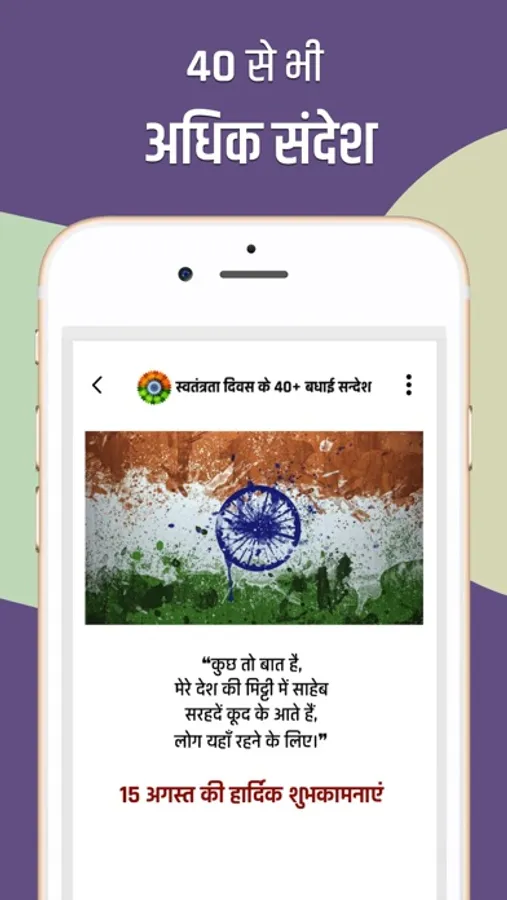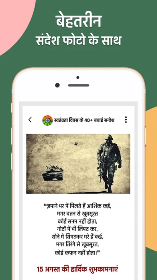 हमने उन्ही देशभक्तों की याद में कुछ शायरी को फोटो के साथ संकलित किया है। आप स्वतंत्रता दिवस के सुन्दर ग्रीटिंग्स (Greetings) बनाकर सोशल मीडिया पर अपनों को शेयर कर सकते हैं।