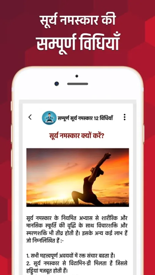योगासनों में सर्वश्रेष्ठ "सूर्यनमस्कार" को बताया गया है। सूर्य नमस्कार स्त्री,पुरुष,बाल,युवा तथा वृद्धों के लिए भी उपयोगी माना जाता है। हमारी इस एप्प में आपको सूर्यनमस्कार (रवि नमस्कार) के सभी आसनों की सम्पूर्ण विधि तथा उनसे होने वाले फायदों के बारे में बताया गया है।