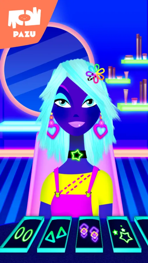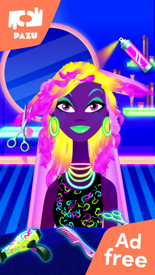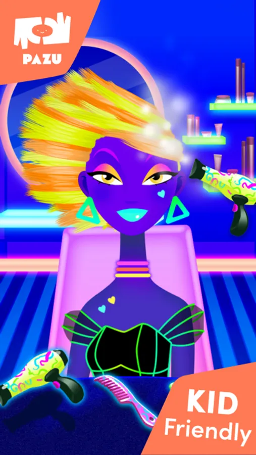 Girls Hair Salon is a fun and interactive game from developers PAZU Games. Now you can own your own hair salon where you can color, cut, and dress your very own animated characters! Become the fashion glow stylist you’ve always wanted to be and makeover your character as you wish. Girls Hair Salon is a hair game full of interactive features and innovative tools to help you become the neon costume stylist you’ve always dreamed of and turn your characters into glow star! Here’s how!