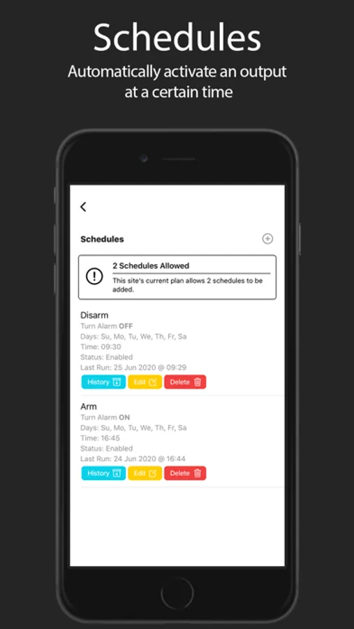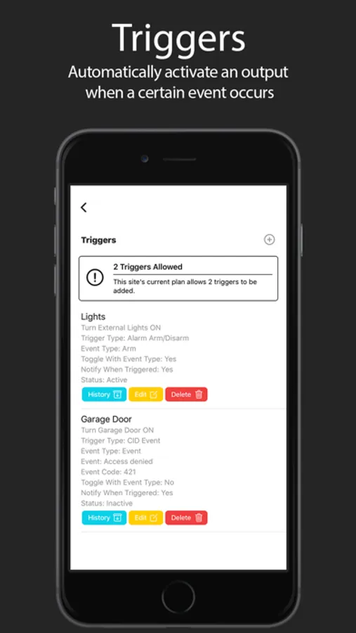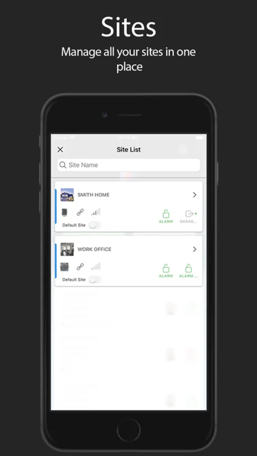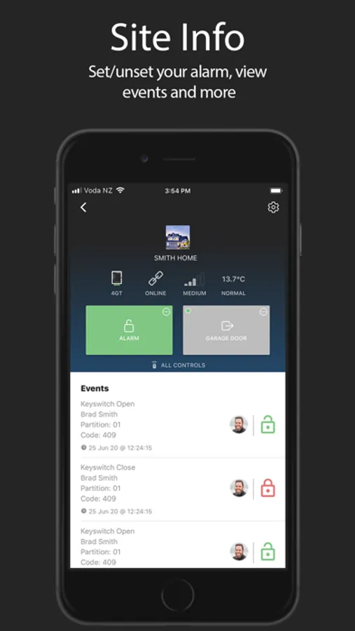 - Manage sites and view events. Identify specific users arming or disarming and other critical information from your alarm system.