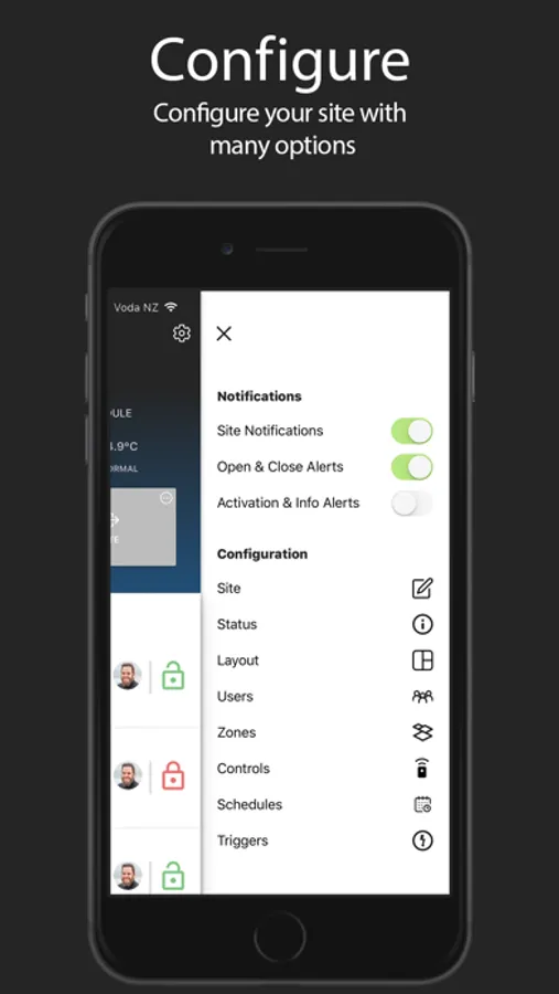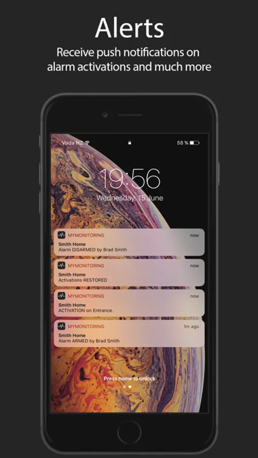 - Receive push notifications when users control outputs, arm or disarm your alarm and alarm activations.