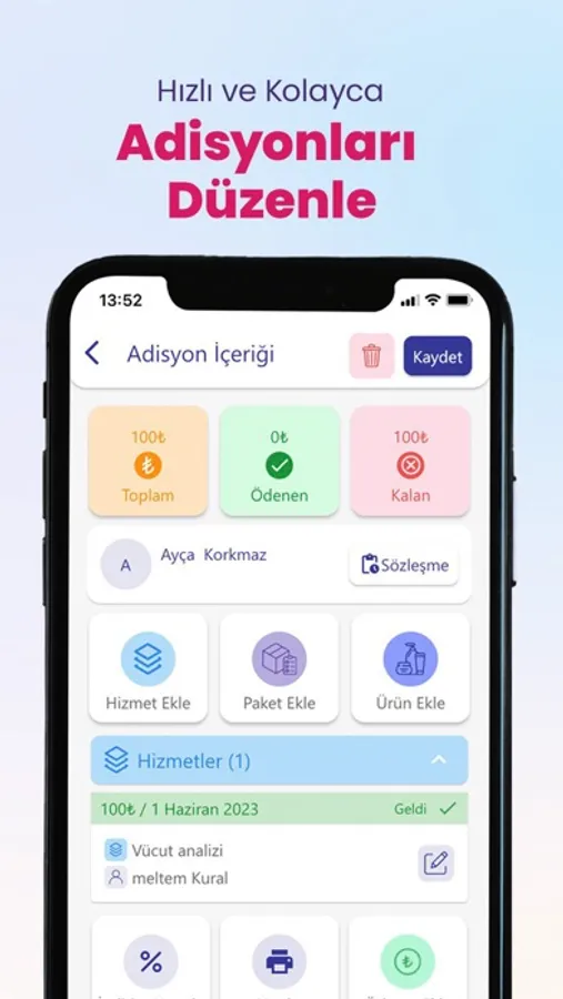 Adisyonlarınızı sistem üzerinden takip edin. İşlem ve ürün satışlarını tek bir yerden takip edin. Gelir ve giderinizi kayıt altına alın. En gelişmiş paket yönetim seçenekleri ile seanslı satışlarınızı kolayca takip edin.