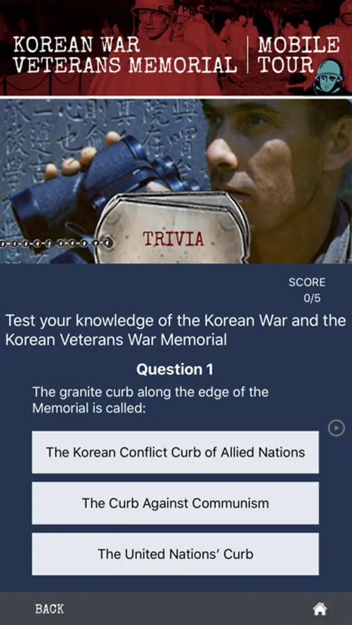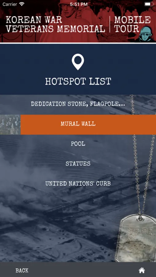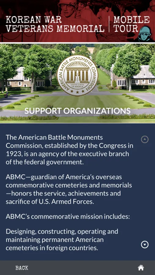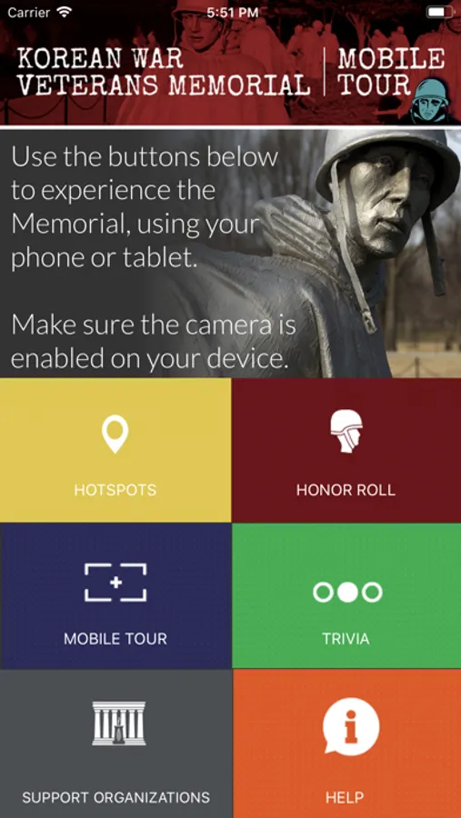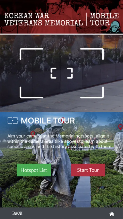 Korean War Veterans Memorial Mobile Tour is an app that allows visitors to the Korean War Veterans Memorial, in Washington, DC, to interact with the site in a completely immersive way, using their mobile devices. The Mobile Tour uses augmented reality and geolocation technology to educate visitors on various elements of the memorial, through videos, stories and a first-of-its-kind 360-degree tour on the National Mall. The Mobile Tour includes memorial facts about memorial features (with vetted content by world-class historians), trivia game, a how-to video on how to use the app and much more.
