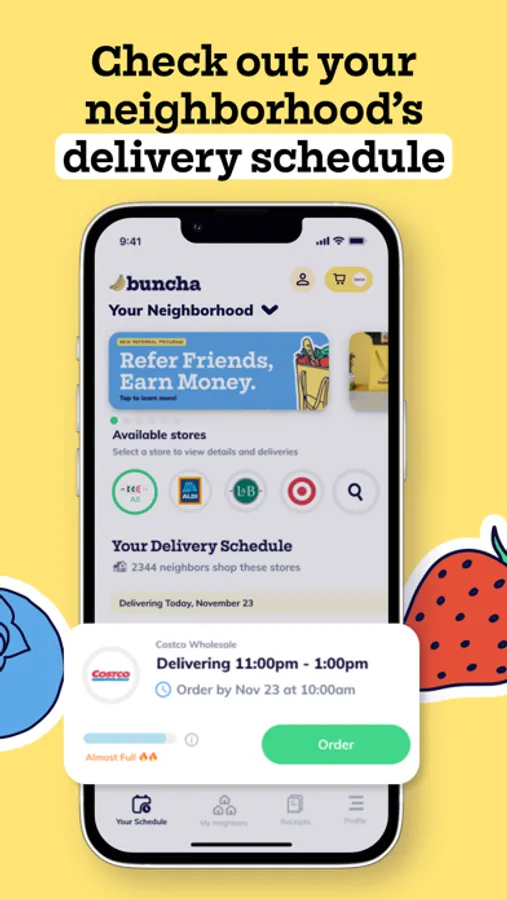 Neighbors on Buncha save on the essentials they need each week by joining scheduled deliveries from their favorite stores. Through store partnerships and eco-friendly neighborhood routes, Buncha is better for the people, the pocket, the planner, and the planet.