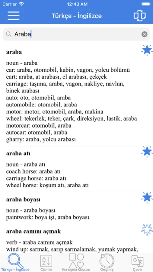 The Turkish English Dictionary & Translator app enables you to search both Turkish & English words with definitions, examples, pronunciation, and more.