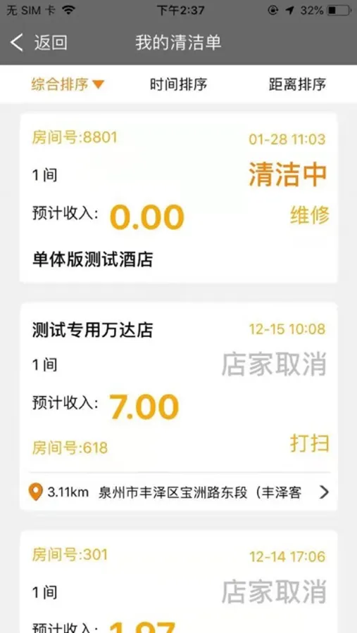2.酒店发布的打扫订单实时推送,阿姨可以根据相应的因素接单。
