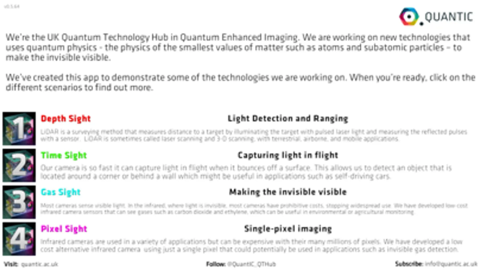 QuantIC is the UK Quantum Technology Hub in Quantum Enhanced Imaging and we’re working on new technologies that uses quantum physics – the physics of the smallest values such as atoms and photons to make the invisible visible. We’ve created this 3D augmented reality app to demonstrate some of the imaging technologies we are working on such as cameras that can see around corners and cameras that image invisible gases.