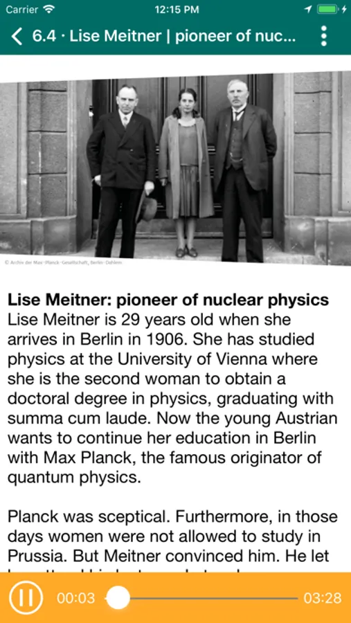 Accompany Otto Hahn and Lise Meitner as they discover nuclear fission and listen to the story of their unusual friendship that survived two world wars and a regime of terror.