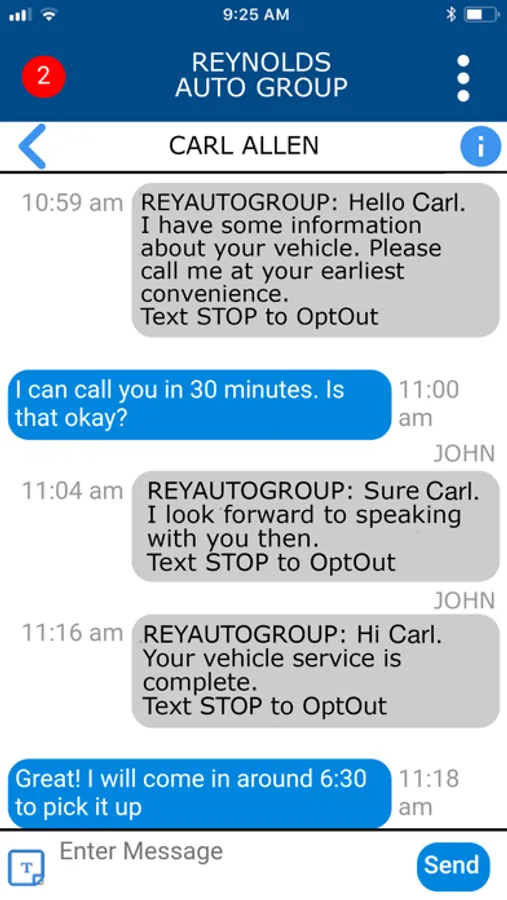 ReyText from Reynolds and Reynolds allows dealership personnel to engage with customers through text messages. For example, employees can text vehicle service updates to customers, follow-up with a sales lead after a test drive, or let a customer know when his vehicle repair is complete. Designed and built as part of Reynolds Retail Management System, ReyText stores conversation history with the customer profile to maintain a relationship throughout the ownership experience. ReyText also enhances productivity and efficiency as employees are no longer tied to workstations when communicating with customers. This mobile application gives users the functionality of standard text messaging applications, while offering the elite security and capabilities of operating within Reynolds Retail Management System.