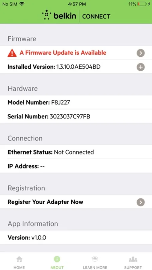 A convenient way to manage your Ethernet + Power Adapter with Lightning Connector’s firmware and access release notes on the most recent update. Know your firmware’s status every time you connect, you can even choose to receive notifications when an update is available. Learn more about your adapter, access the latest update’s release note and connect with Belkin support through this single app.