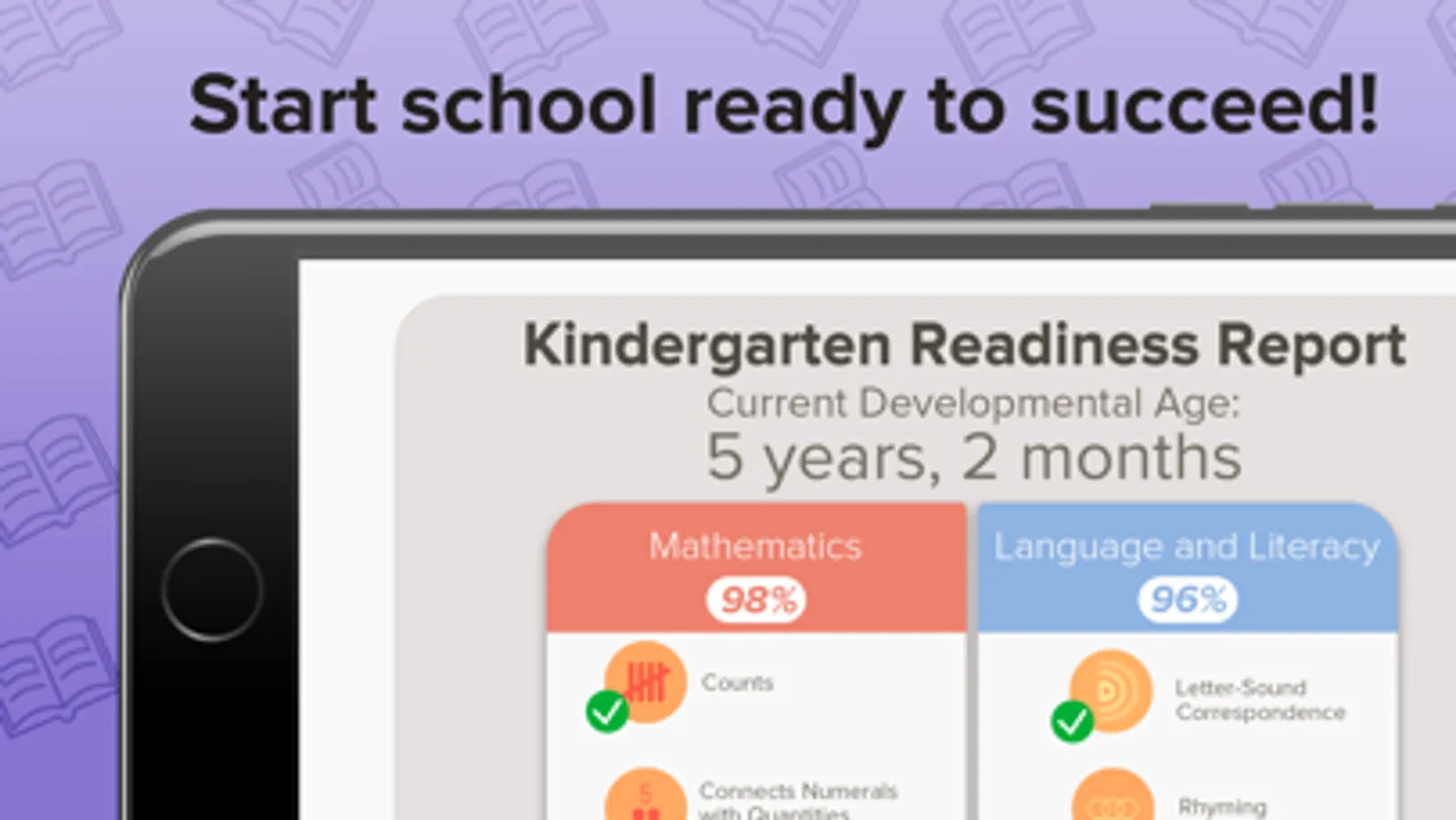 Follow your customized schedule to minimize screen time and assess what you want. Reports created after each assessment recommend real-world practice activities for the week that are tailored to your child’s current developmental age. Practice activities have been teacher-approved to make sure they are fun and relevant to the readiness skills your child is still mastering!