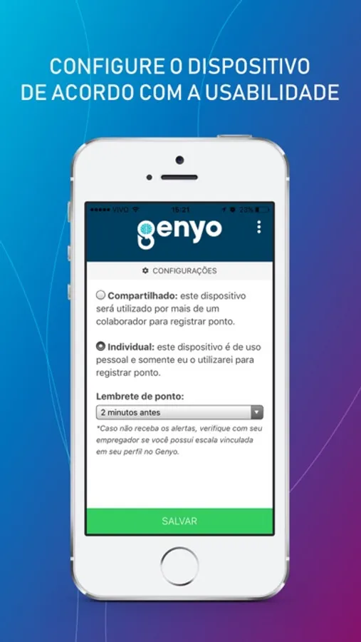 - Modo individual ou compartilhado: vários colaboradores podem registrar ponto do mesmo dispositivo;