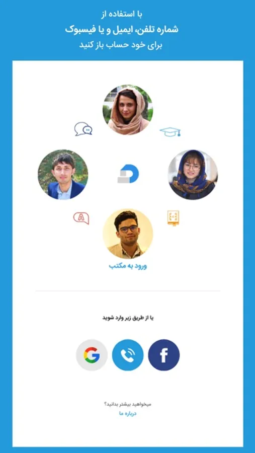 ۶. قابلیت ایجاد حساب و اکانت مکتب با استفاده از شماره تلفن، ایمیل و فیسبوک.