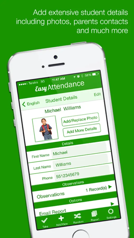 Add extensive student details for each student including parents email, home phone number and much more. You can also add your own customised details