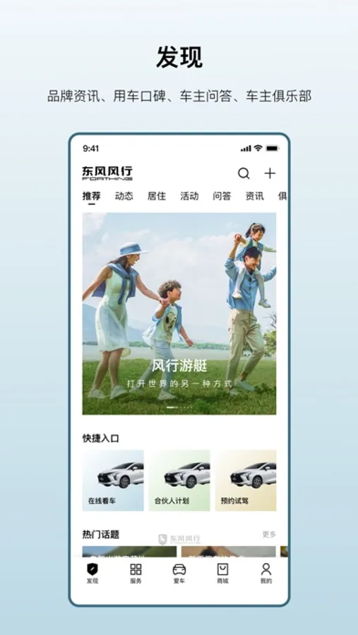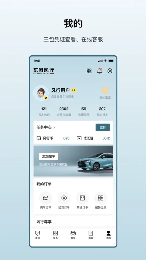 东风风行,集发现、车主服务、商城、车辆与于一体的车主服务平台,拥有更智能化的车载服务。