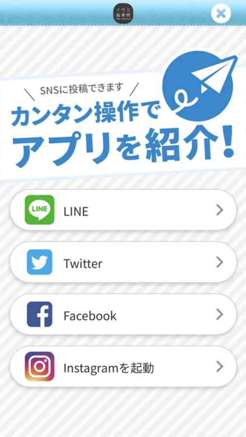 イサミ接骨院のアプリをSNSからお友達に紹介する事ができます。