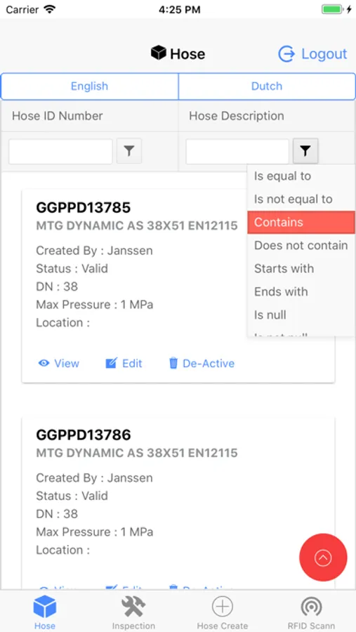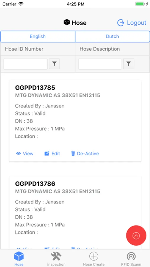 De Hose Management App is een applicatie voor inspecteurs om online inspecties van slangen te beheren. De slangen-informatie wordt elektronisch beschikbaar gesteld aan de inspecteurs met behulp van de streepjescode, QR-code of datamatrixcode. Inspectiebevindingen en zelfinspectie van records worden beheerd in de applicatie met realtime meldingen en waarschuwingen voor het aflopen van de slang voor de gebruikers.