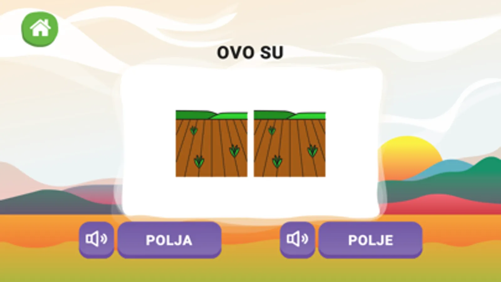 U aplikaciji je moguće izabrati između tri kategorije: 'Imenice', 'Glagoli' i 'Igra parova'. Svi zadatci vezani uz imenice i glagole potkrijepljeni su vizualnim i auditivnim podražajem. Vizualno su prikazani simboli koji predstavljaju određeni pojam, a auditivno se reproducira zadatak i ponuđeni odgovori. Te značajke čine zadatke zanimljivim i motivirajućim, a istovremeno olakšavaju usvajanje koncepta množine.