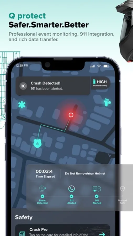 - Crash Detection based on smart algorithm and uses specially designed, dedicated sensors in the helmet