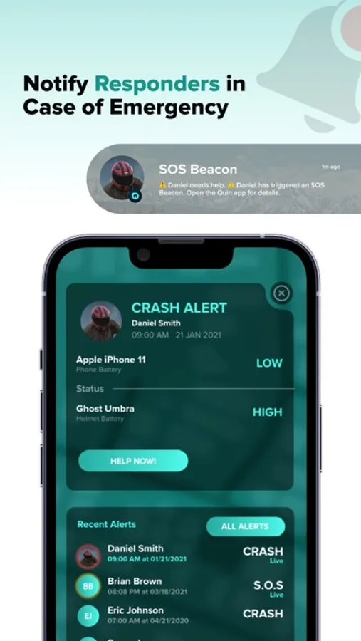 The Quin Ride App is the essential companion for your Quin Design Helmet, providing you the ability to automatically trigger emergency alerts when your helmet detects a crash and so much more. Never be without a "Good Samaritan" and always ride protected.