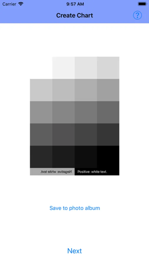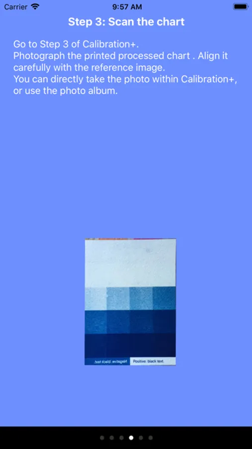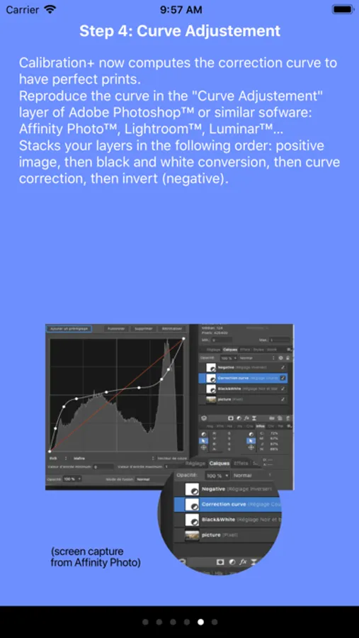 With Calibration+, generate a reference chart on your device. Use your favorite image processing software :Adobe Photoshop™, Gimp, Affinity Photo™, Lightroom™… to generate digital negative. Invert. Flip. Print (as usual).