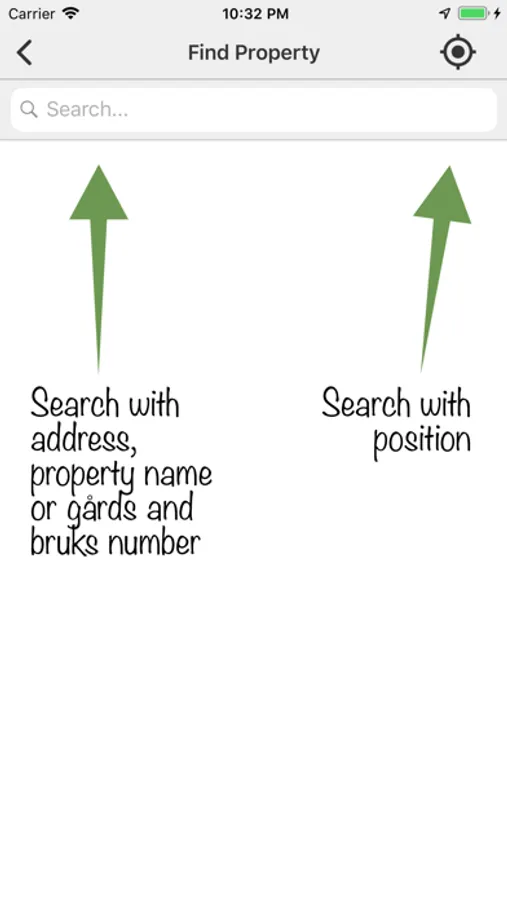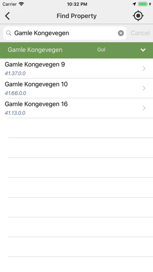 Eiendom velges enten ved å søke på adresse eller ved hjelp av GPS-posisjon.