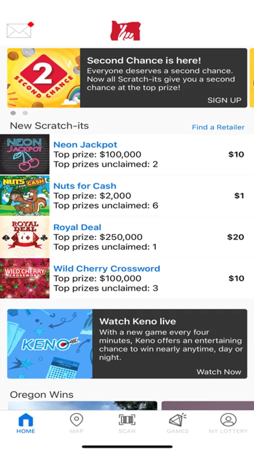 • Live Keno – Purchase your Keno tickets and/or advance draws at an Oregon Lottery retailer and play from home via your mobile application. Double check your ticket to see if you were a winner by quickly switching over to the Oregon Lottery scanning tool.