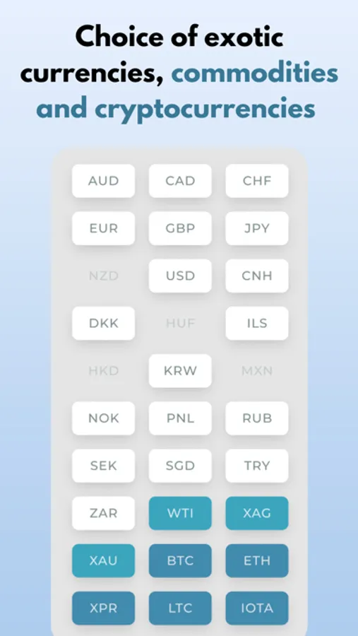The 8 majors currencies are available, as are 14 additional currencies, Oil, Silver and Gold.
