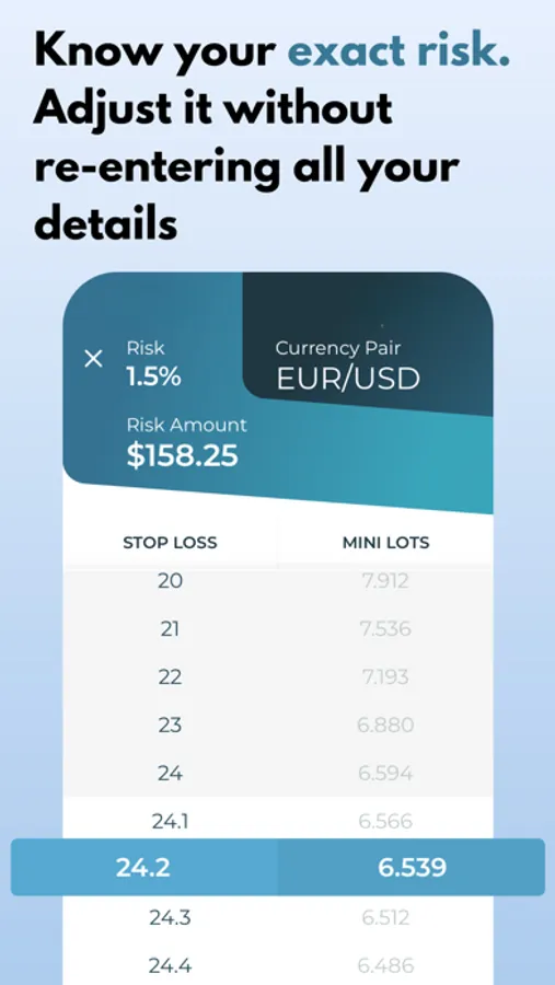 After the calculation of your risk, have an instant overview of the position size in case your stop loss has to be a few pips higher or lower.