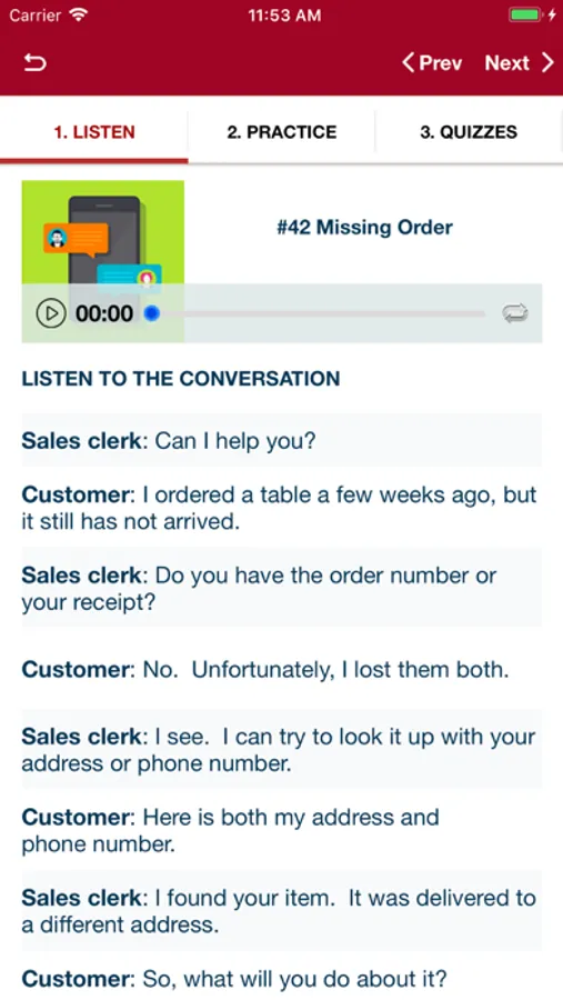 - Each lesson comes with audio, transcript and quizzes, which help you to improve your English listening, English speaking and expand your English phrases.