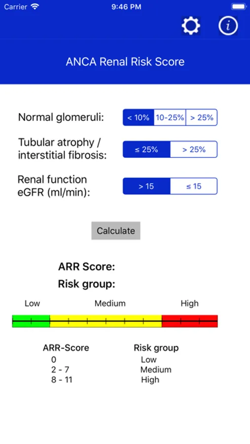 The ANCA score predicts the end stage renal disease (ESRD) probability in patients with ANCA vasculitis. The three essential input data are: 1. number of normal glomeruli, 2. amount of tubular atrophy and fibrosis and 3. estimated glomerular filtration rate at time of diagnosis. The calculated app output is based on a clinical trial (published in Kidney International 2018).